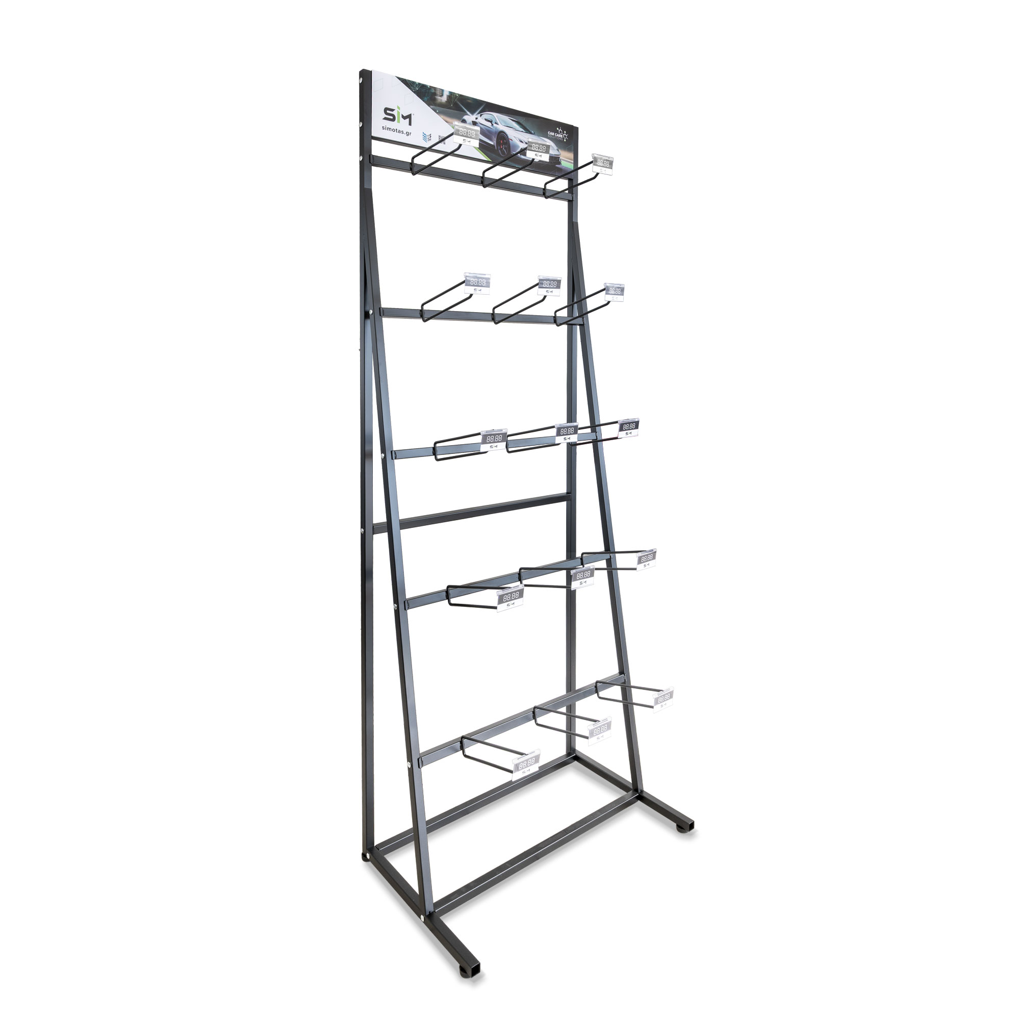 Μεταλλικός επιδαπέδιος εκθέτης 180x64x41 cm με 15 ενσωματωμένα γατζάκια και αντίστοιχα ταμπελάκια τιμών για προβολή προϊόντων περιποίησης SIM & FLOWEY